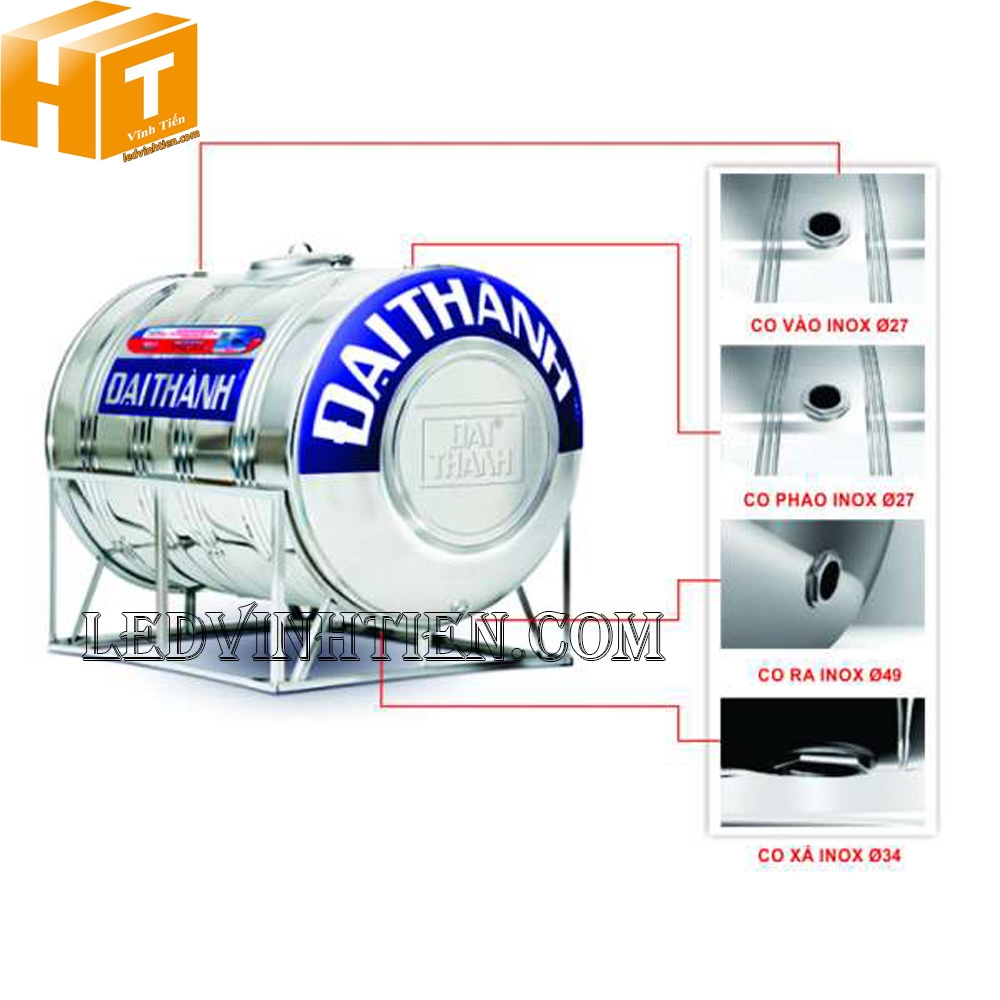 - Bồn nước inox Đại Thành 6000L lít Ngang được thiết kế sẵn các co nước vào, co nước ra, co gắn phao và co nước xả cặn. Các co nước có thể khoan lớn hơn hoặc nhỏ hơn theo nhu cầu sử dụng.