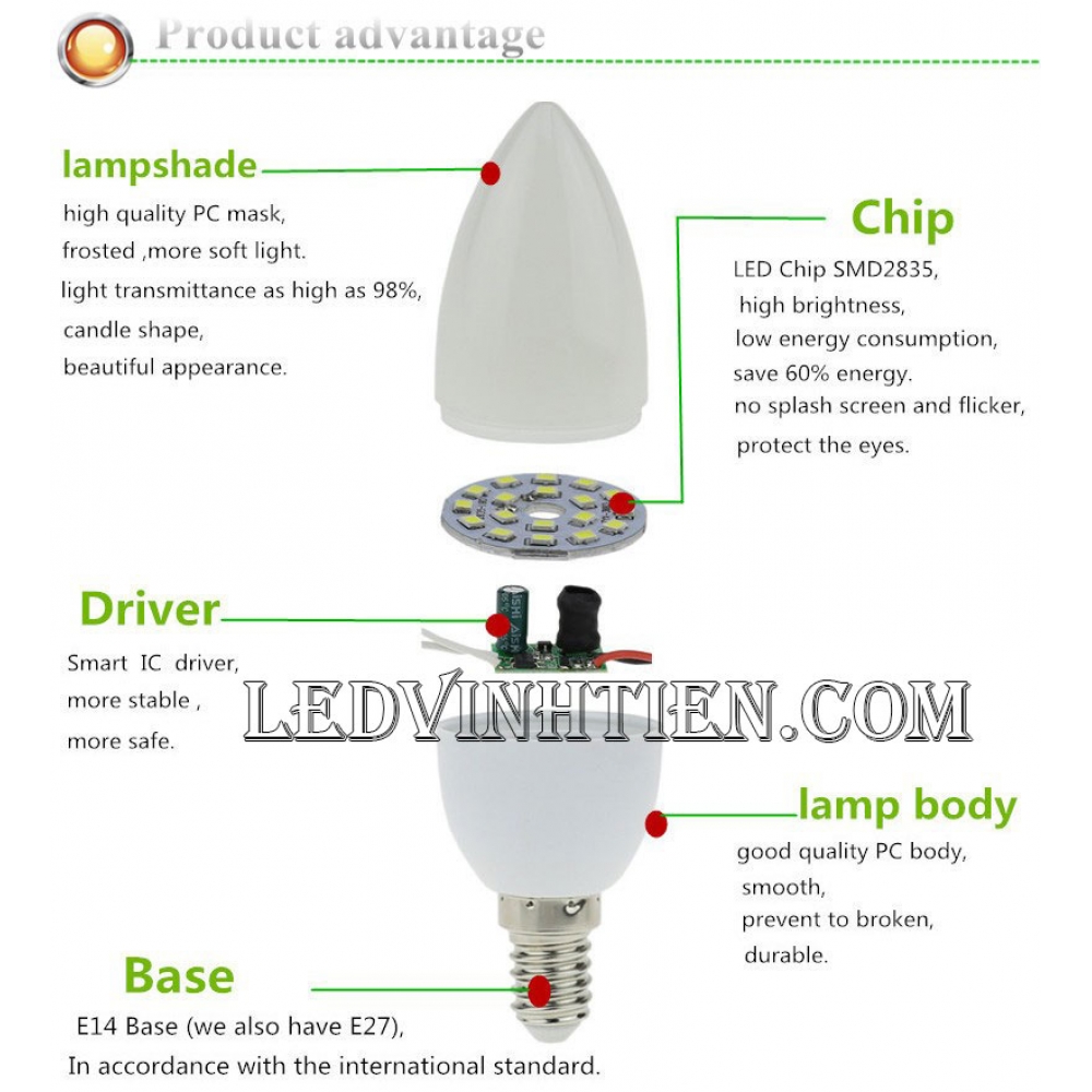 Đặc điểm kỹ thuật bóng led nến, bóng led trái ớt loại tốt, giá rẻ, ánh sáng trắng