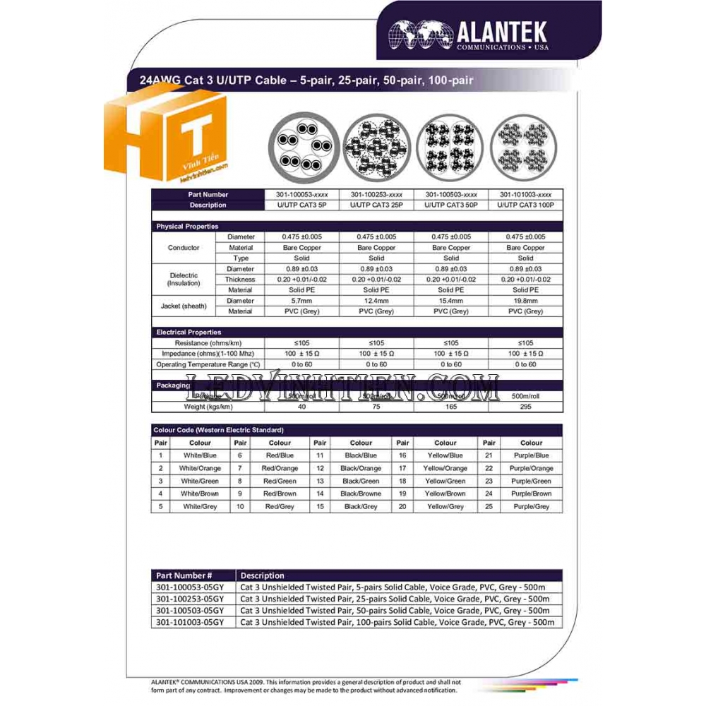 Thông số kỹ thuật dây cáp điều khiển Alantek 301-CI9201-0500