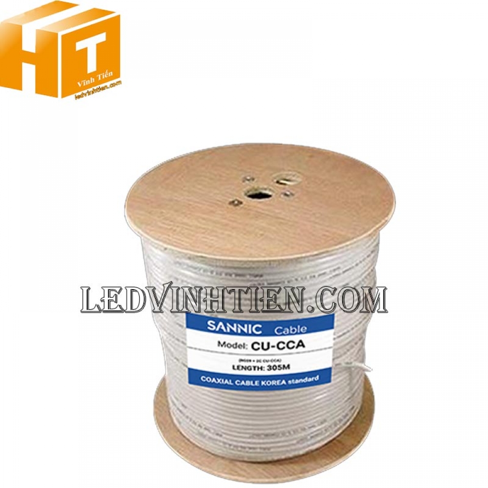 - Cáp đồng trục liền nguồn SANNIC CU cuộn 305m màu trắng là dòng sản phẩm cáp tín hiệu chuyên dụng cho ngành CCTV chính hãng. Có 128 sợi chống nhiễu, kích thước lõi đồng 0.1mm. Chuyên dụng cho camera thích hợp cho việc đi dây trong văn phòng.