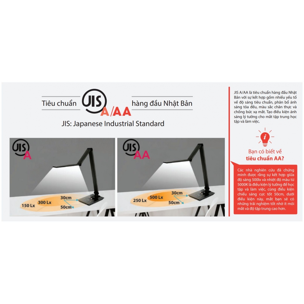 - Cường độ sáng theo tiêu chuẩn Nhật Bản JISAA - phù hợp và tối ưu cho mắt.