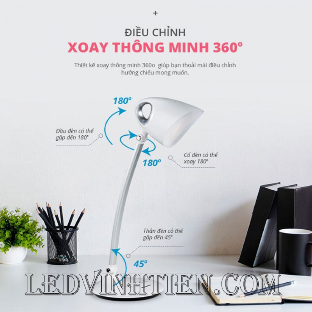 - Đầu đèn có thể xoay 180o, thân đèn gật 45o