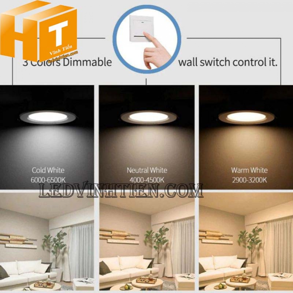 Đèn led âm trần hay còn gọi là đèn led downlight, đèn led panel light 12w, đèn led âm trần tròn. Ánh sáng chiếu trực tiếp từ trên xuống cung cấp ánh sáng cho không gian nhưng không làm chói mắt, tăng tính thẩm mỹ và giảm khả năng cận thị. Sản phẩm nổi bật nhất là đèn led âm trần tròn 3 màu 12w của Vĩnh Tiến có hiệu suất chiếu sáng cao, ánh sáng đều. Sử dụng Driver chống nhiễu tốt, giảm nhiệt độ cho driver, tăng tuổi thọ đèn. Đèn leđ âm trần tròn 12w 3 màu được đúc bằng nhựa cao cấp giúp tản nhiệt nhanh. Loại đèn này được sử dụng rộng rãi trong việc trang trí nội thất gia đình, khách sạn, nhà hàng phục vụ cho việc chiếu sáng tại các phòng như phòng ngủ, phòng bếp, phòng khách…Ưu điểm của nó là có thể chiếu sáng tại cả những nơi khó lắp đặt, hay những nơi cao tầng. Hơn thế nữa, đèn có 3 chế độ màu sáng theo thứ tự Trắng, Vàng, Trung tính sau mỗi lần bật/tắt. Đèn led này có thân màu trắng sang trọng, đa dạng màu sắc ánh sáng thích hợp cho việc trang trí và chiếu sáng cho những như siêu thị, bệnh viện, khách sạn, trung tâm thương mại, trường học, văn phòng, resort…