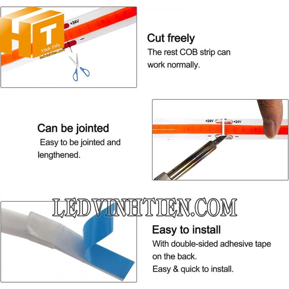 - Người dùng có thể cắt ra và đấu nối nguồn nhờ các điểm hàn dọc theo dây led COB.