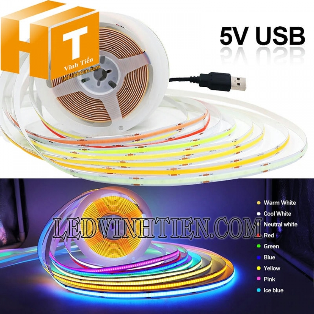- Bằng cách cắt bỏ đầu USB, led dây COB có thể sử dụng trực tiếp với bộ nguồn 5V DC hoặc thông qua bộ dimmer để làm mờ.
