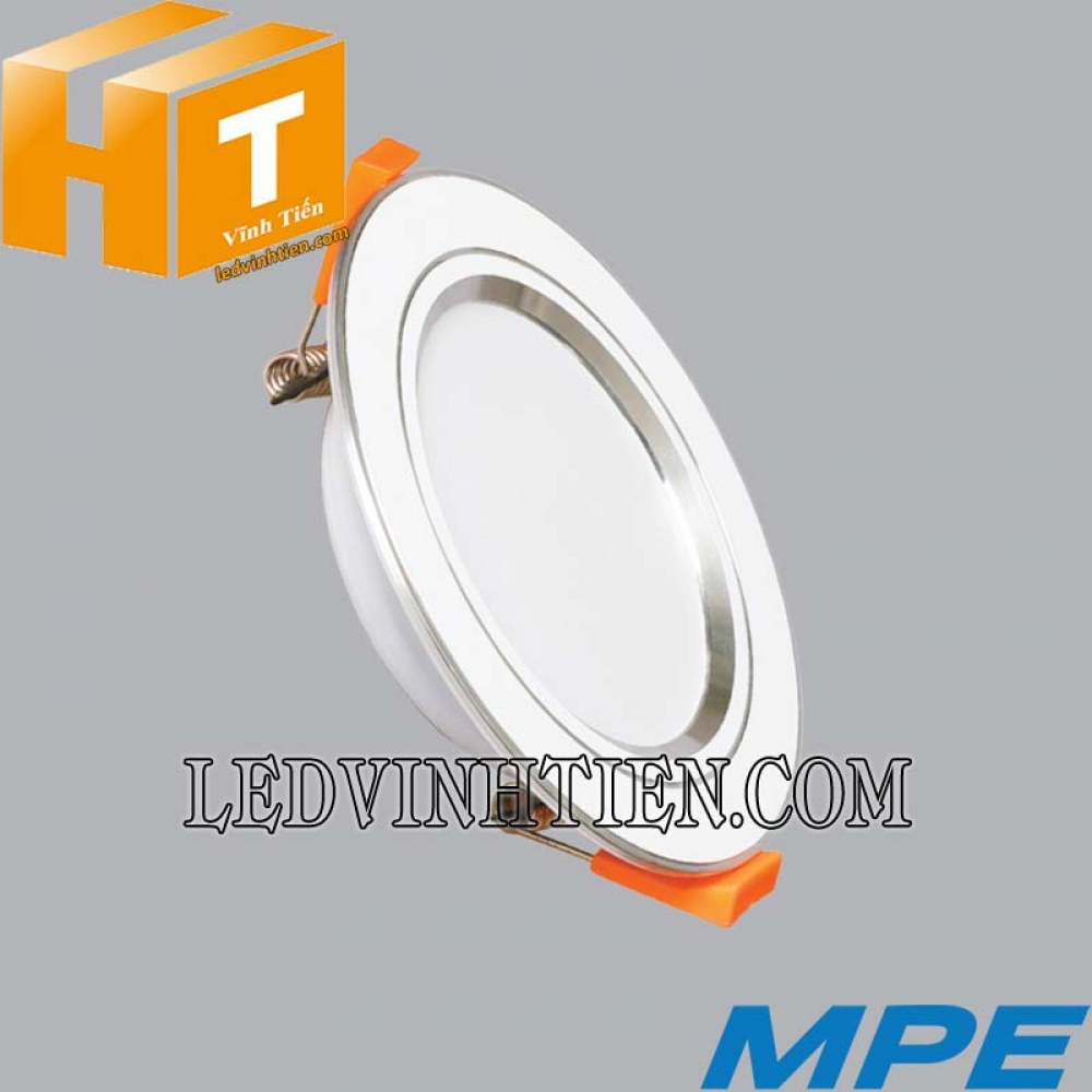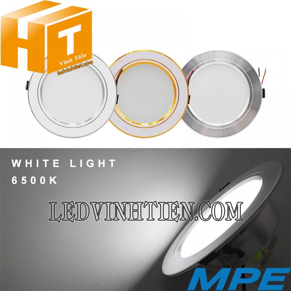 - Đèn led downlight MPE 7W có 3 loại ánh sáng trắng, vàng, trung tính tương ứng các mã DLB-7T, DLB-7V, DLB-7N.