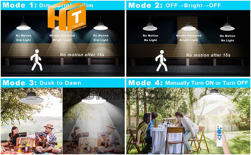 - Chế độ chiếu sáng: Cảm biến PIR / điều khiển thời gian