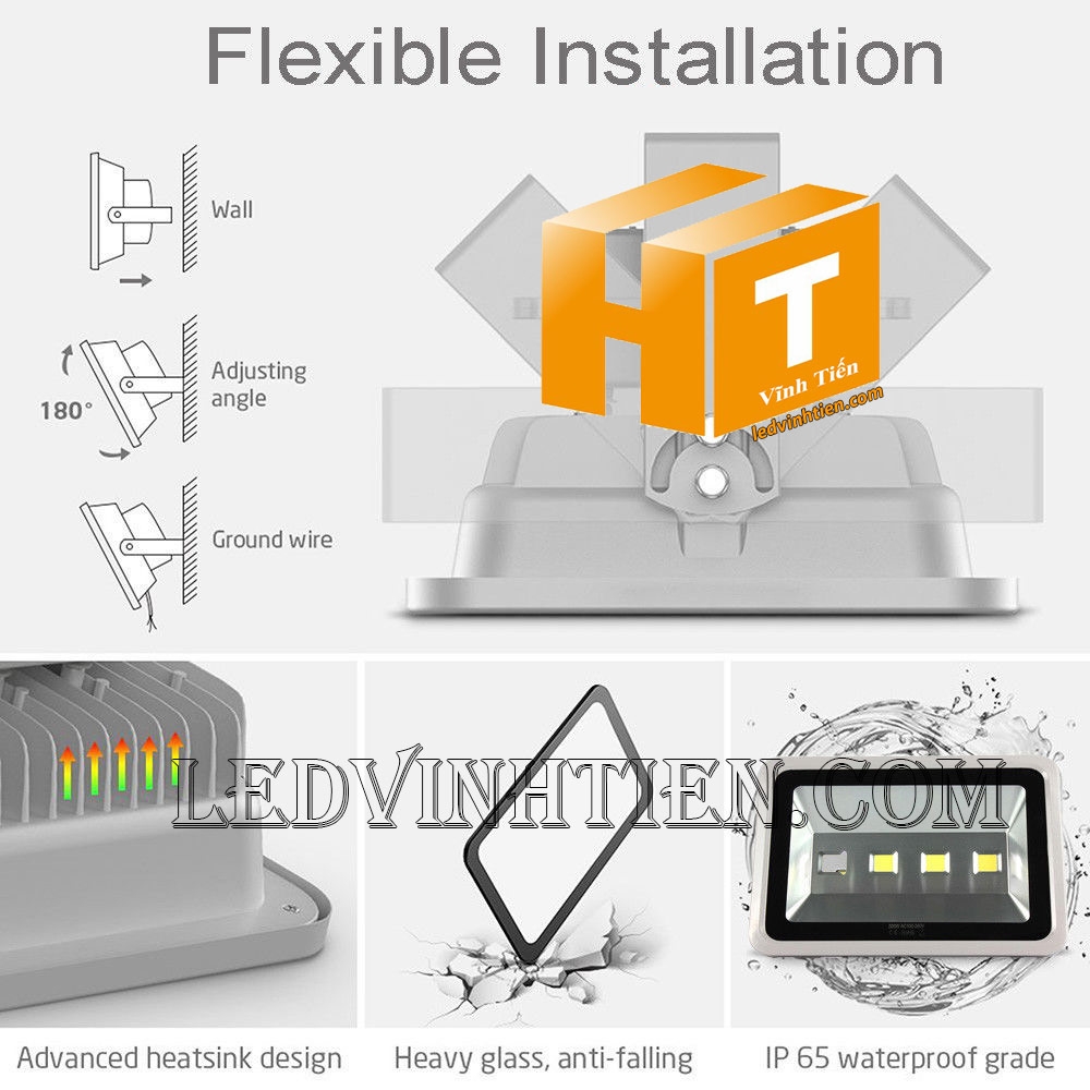 Hình ảnh chi tiết từng góc cạnh của đèn pha led 200W vỏ xám loại tốt, giá rẻ, chất lượng, ngoài trời, chính hãng ledvinhtien.com
