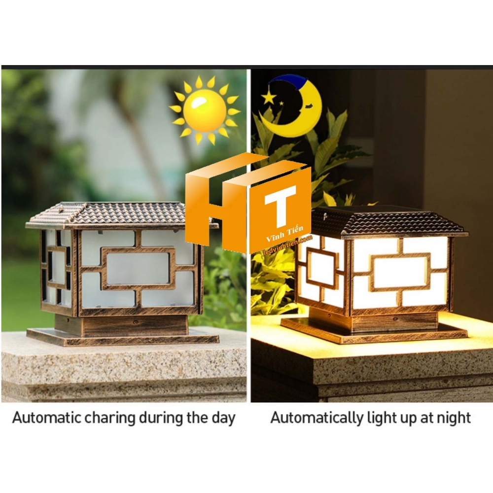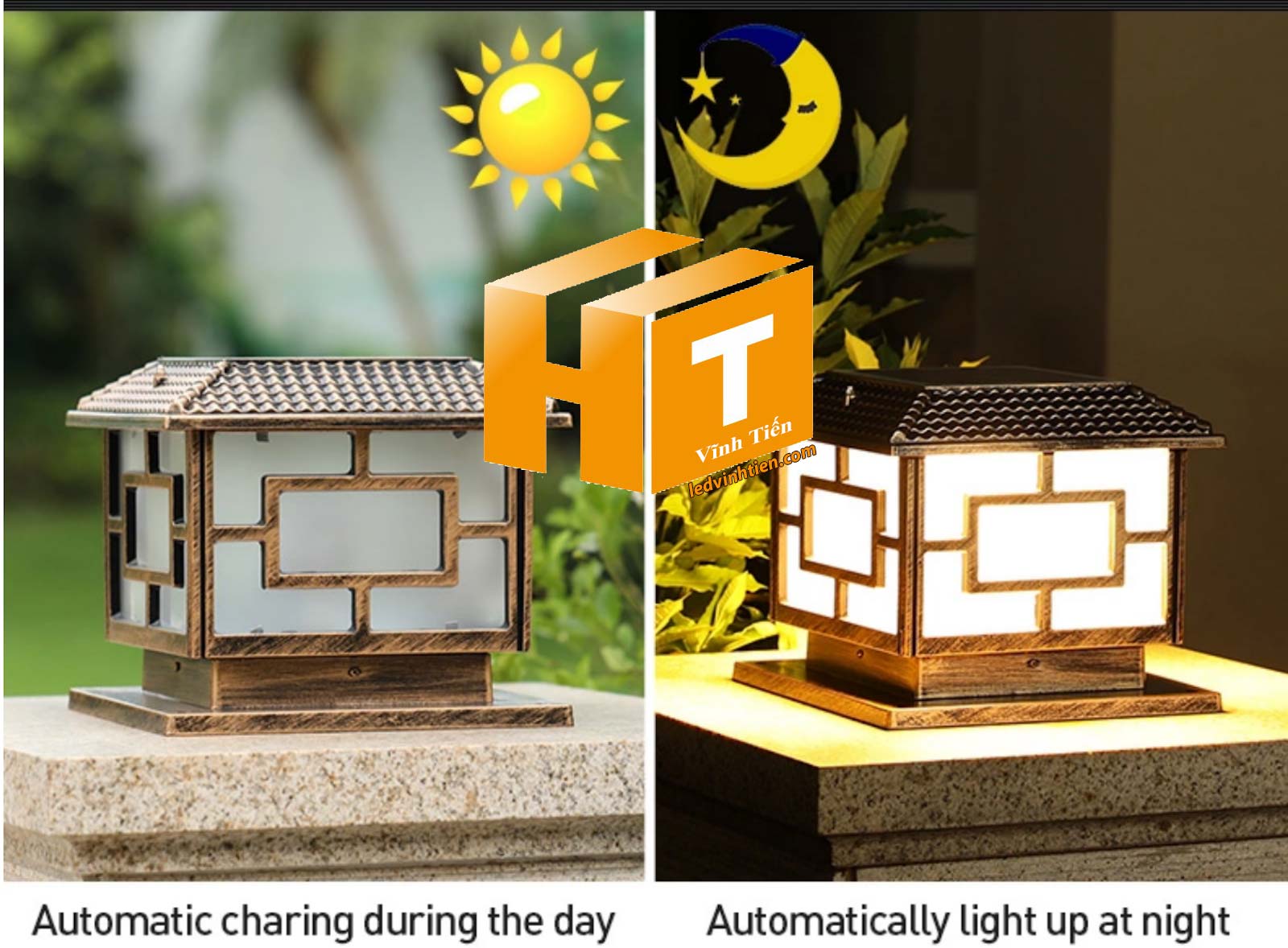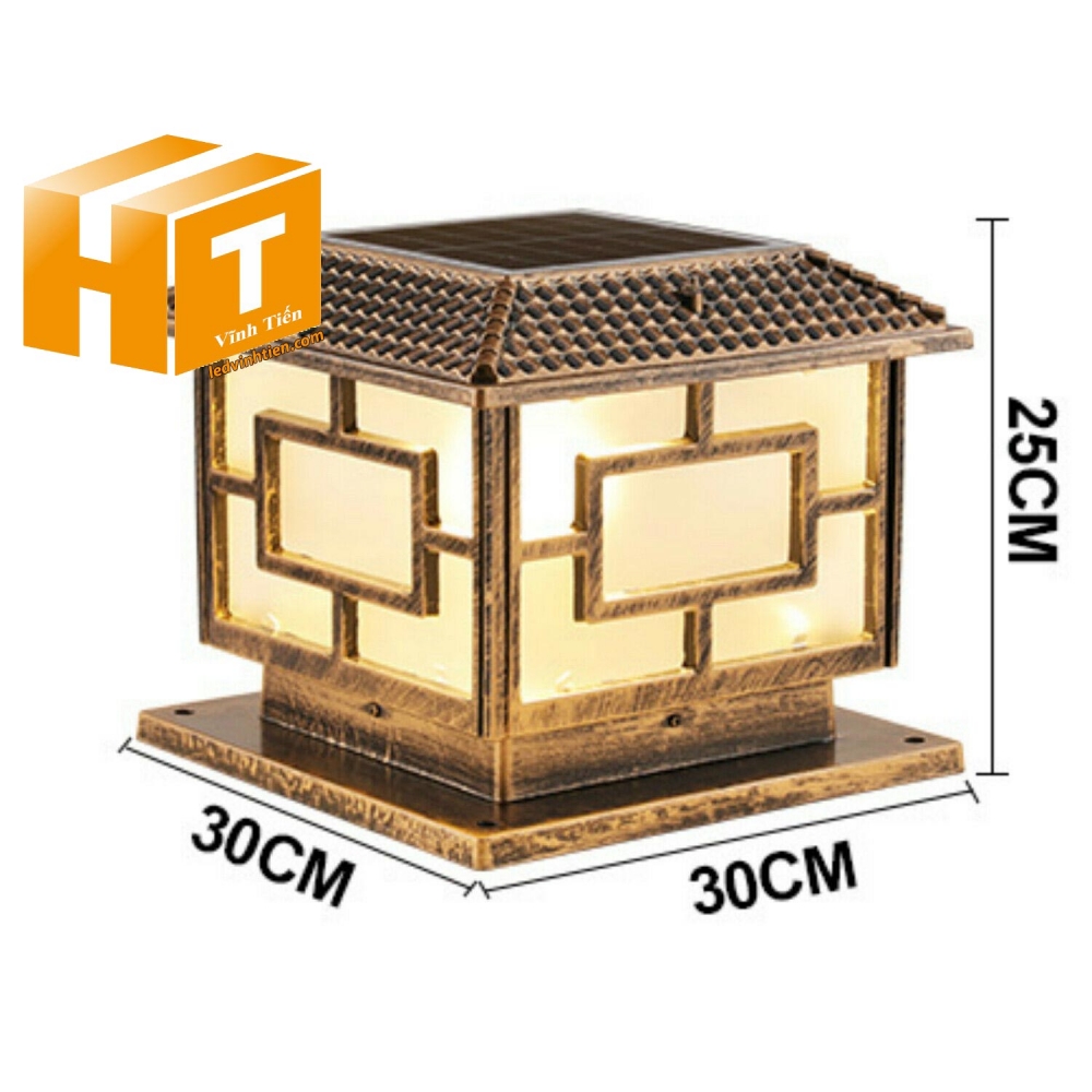 Đèn cột năng lượng mặt trời kích thước 30cm x30cm x 25cm chạy bằng năng lượng mặt trời, đó là lựa chọn tốt của bạn. Với kiểu dáng hiện đại, cổ điển, đèn trụ cổng năng lượng mặt trời này. Không thấm nước, được thiết kế để mang lại ánh sáng trắng mát mẻ hoặc ánh sáng trắng ấm áp và được tăng cường với lớp đồng đẹp mắt, dùng chiếu sáng ngoài trời, trụ cổng, chiếu sáng một khu vườn, hiên, lối đi, công viên, quảng trường, bờ kè, quán cà phê sân vườn,...