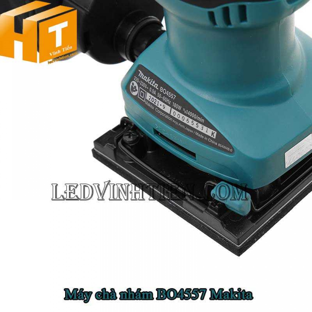 - Máy chà nhám rung Makita BO4557 có vẻ ngoài cứng cáp, tay cầm chắc chắn, chà bóng được đa dạng vật liệu với công suất 180W và tốc độ chà không tải tối đa 14.000 vòng/phút.