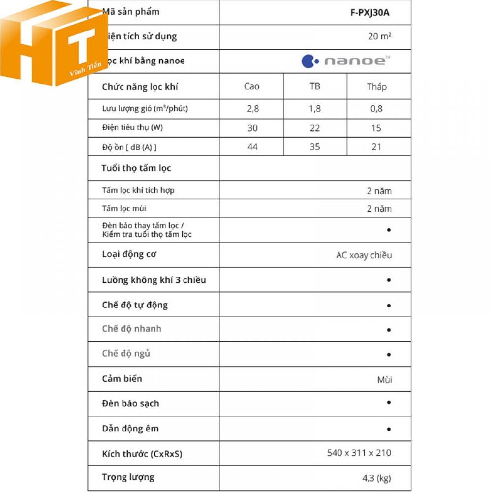 Thông số kỹ thuật của máy lọc không khí F-PXJ30A loại tốt, chính hãng Panasonic, chiết khấu cao