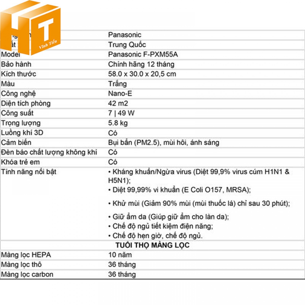 Thông số kỹ thuật của máy lọc không khí F-PXM55A loại tốt, chính hãng Panasonic, chiết khấu cao