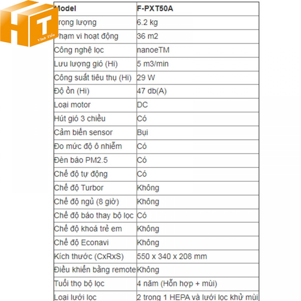 Thông số kỹ thuật của máy lọc không khí F-PXT50A loại tốt, chính hãng Panasonic, chiết khấu cao