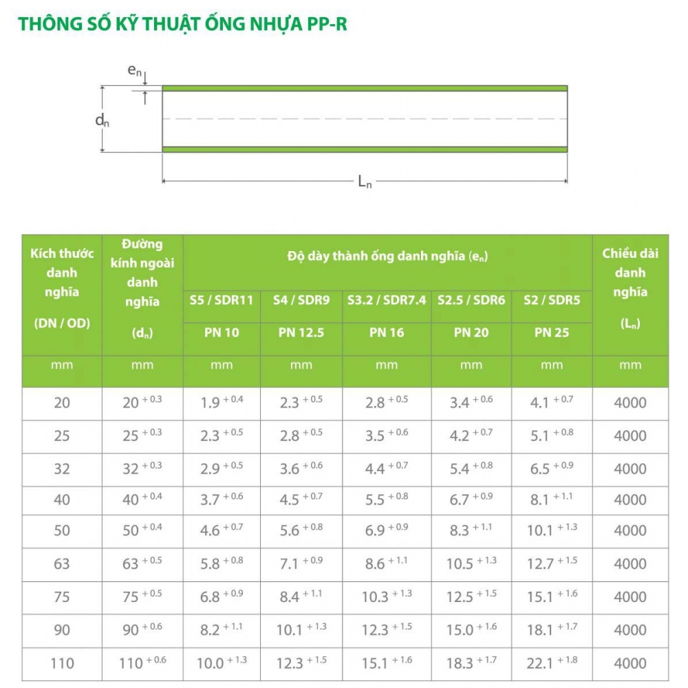 Thông số kỹ thuật ống PP-R loại tốt, giá rẻ, chiết khấu cao, chính hãng
