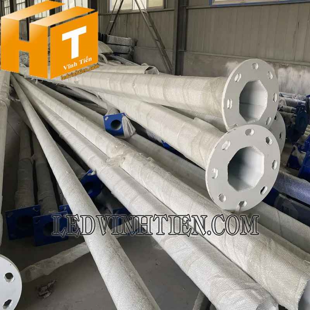 - Cột đèn có chiều cao từ đế cột đèn đỉnh cột là 11m, được hàn dọc từ 8 miếng thép lại với nhau.
